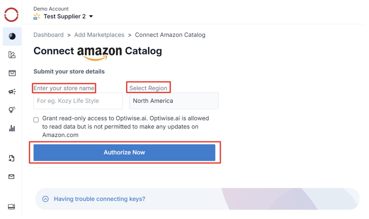 -> It typically takes 20 mins to sync your Amazon catalog with Optiwise.ai once you submit your key details.
