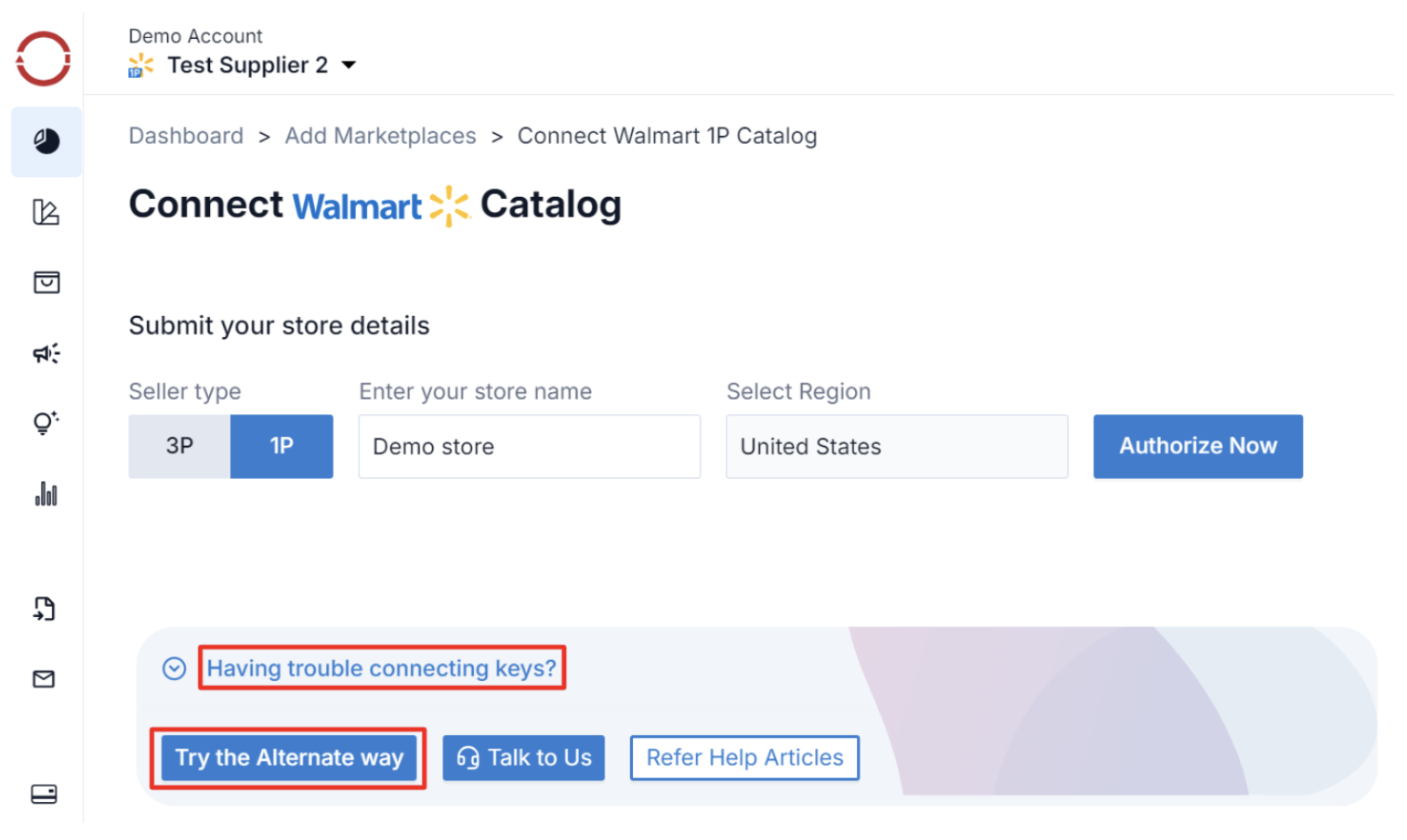 1. In case of facing issues while connecting your Walmart keys via the above method, click on "Having trouble connecting keys?" and select “Try Alternative Way”.