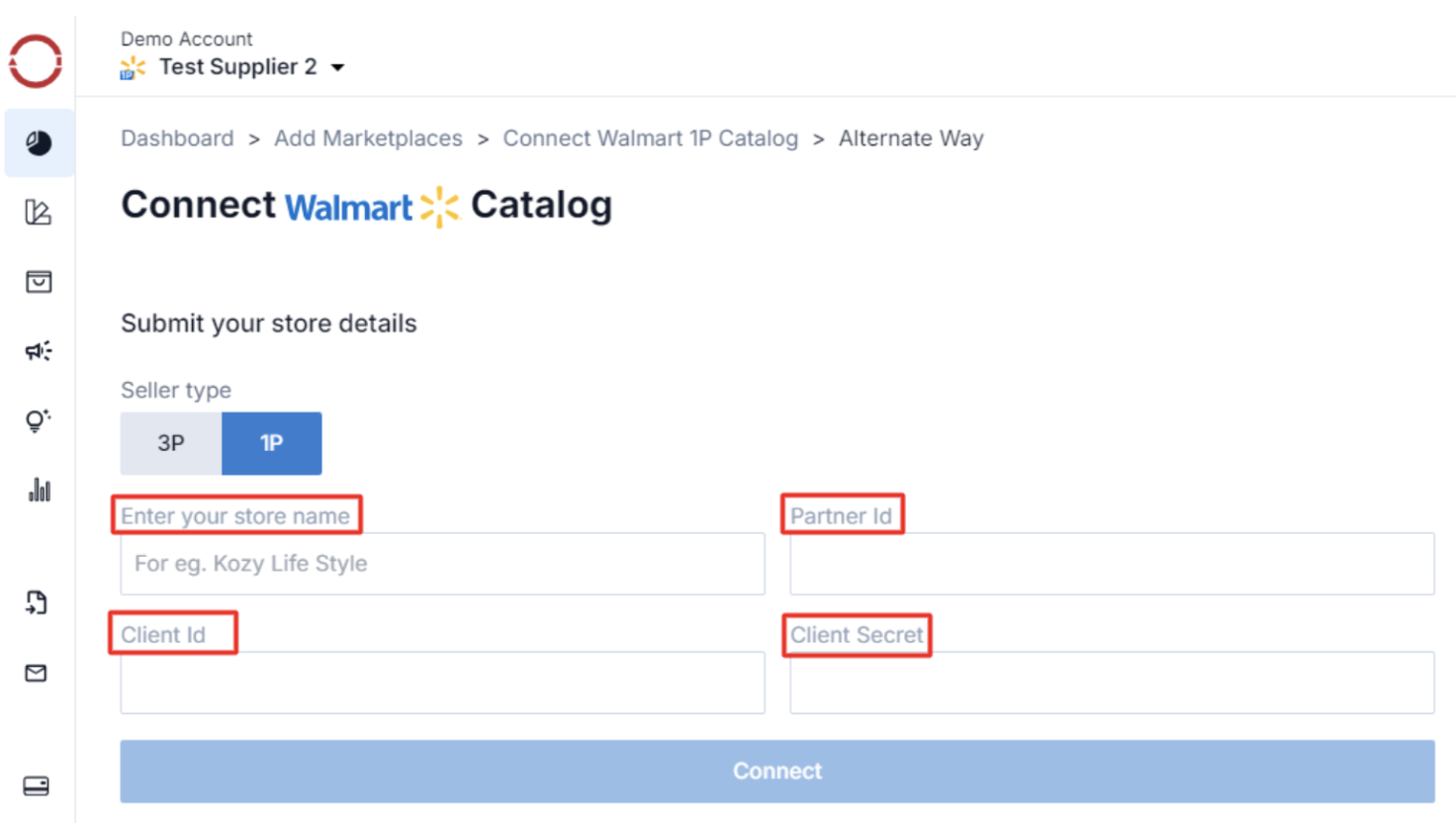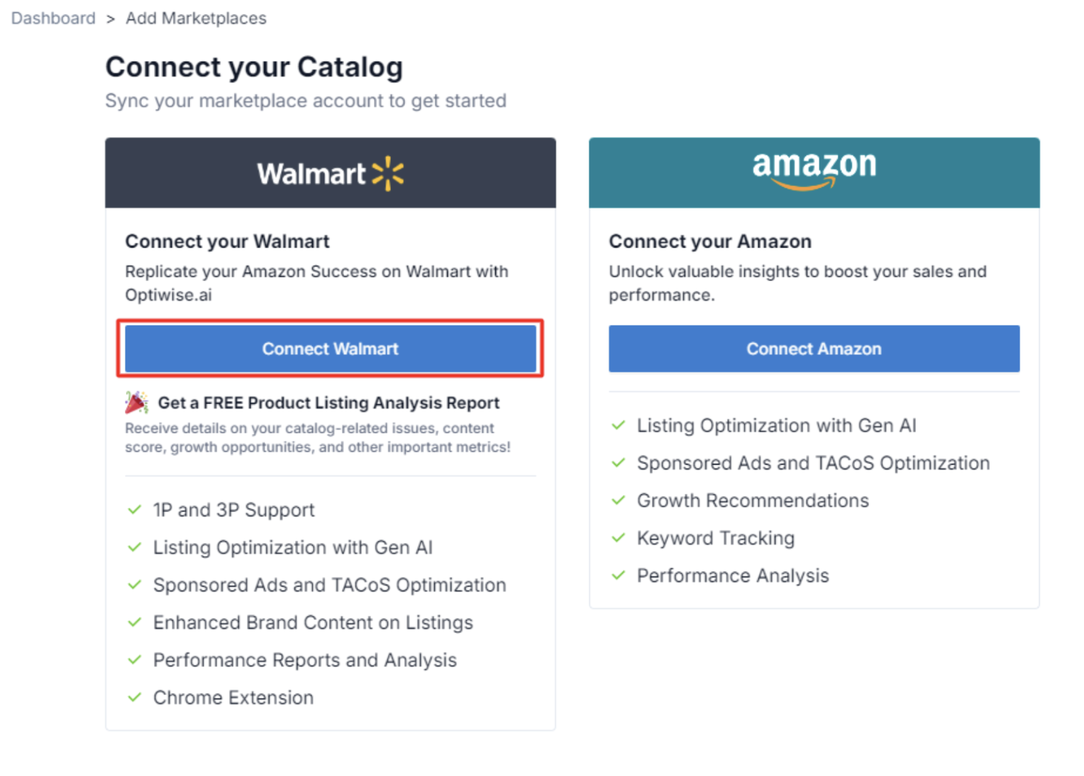 There are two ways to connect your Walmart 1P Product Catalog with Optiwise.ai: